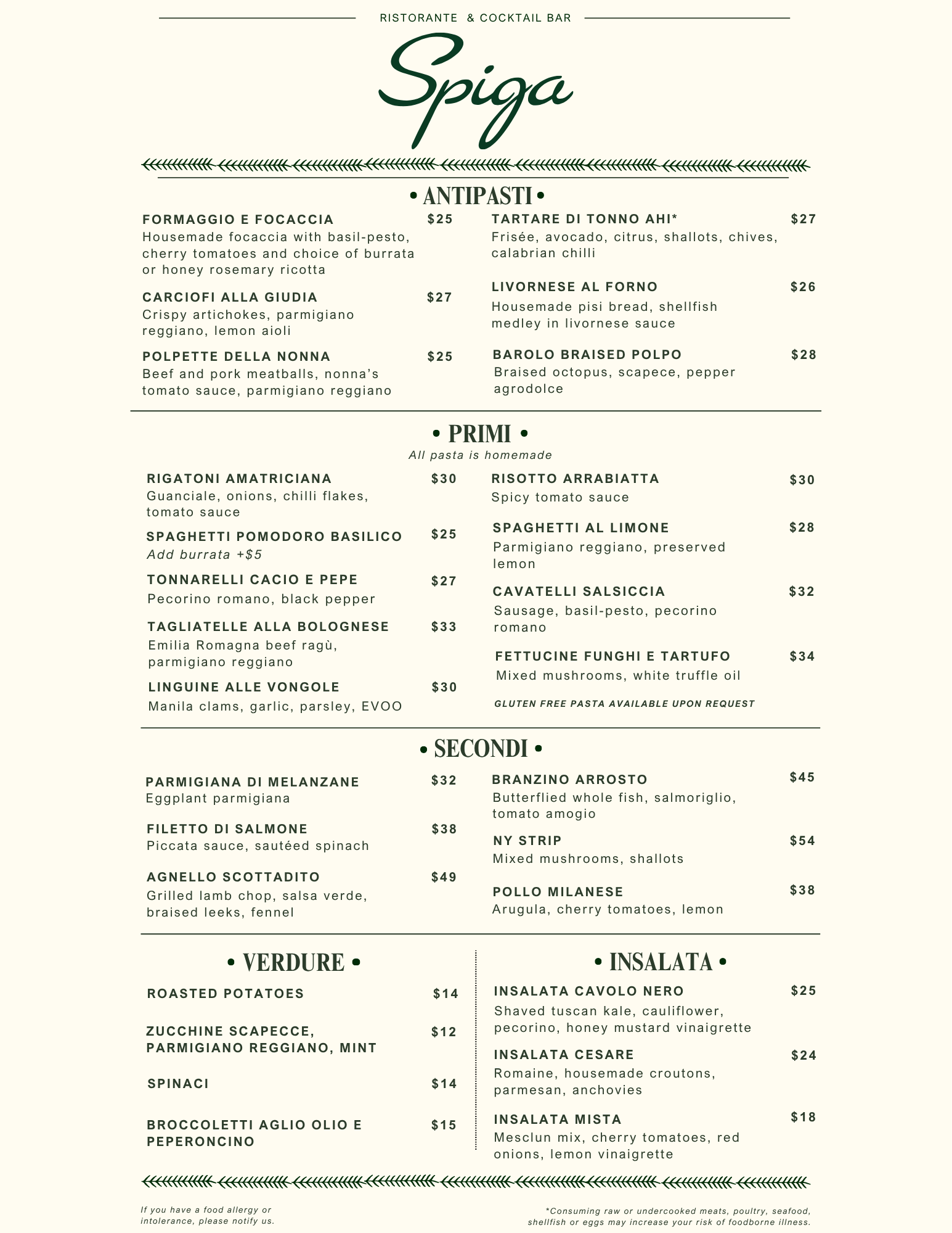 The Spiga team draws on our Italian heritage and extensive culinary experience, bringing a passion for amazing food and warm, genuine hospitality. At Spiga, Italian tradition meets artistry — every dish prepared with the finest ingredients, every moment infused with la dolce vita.